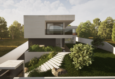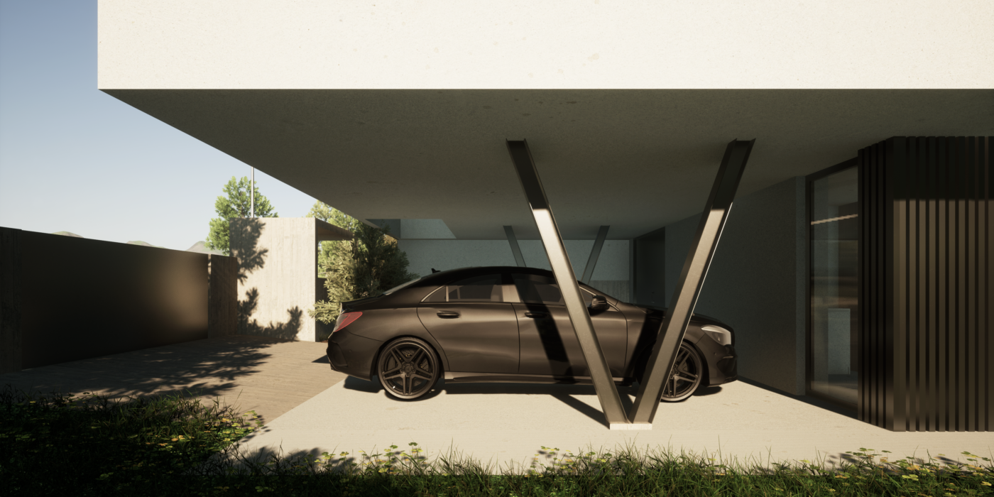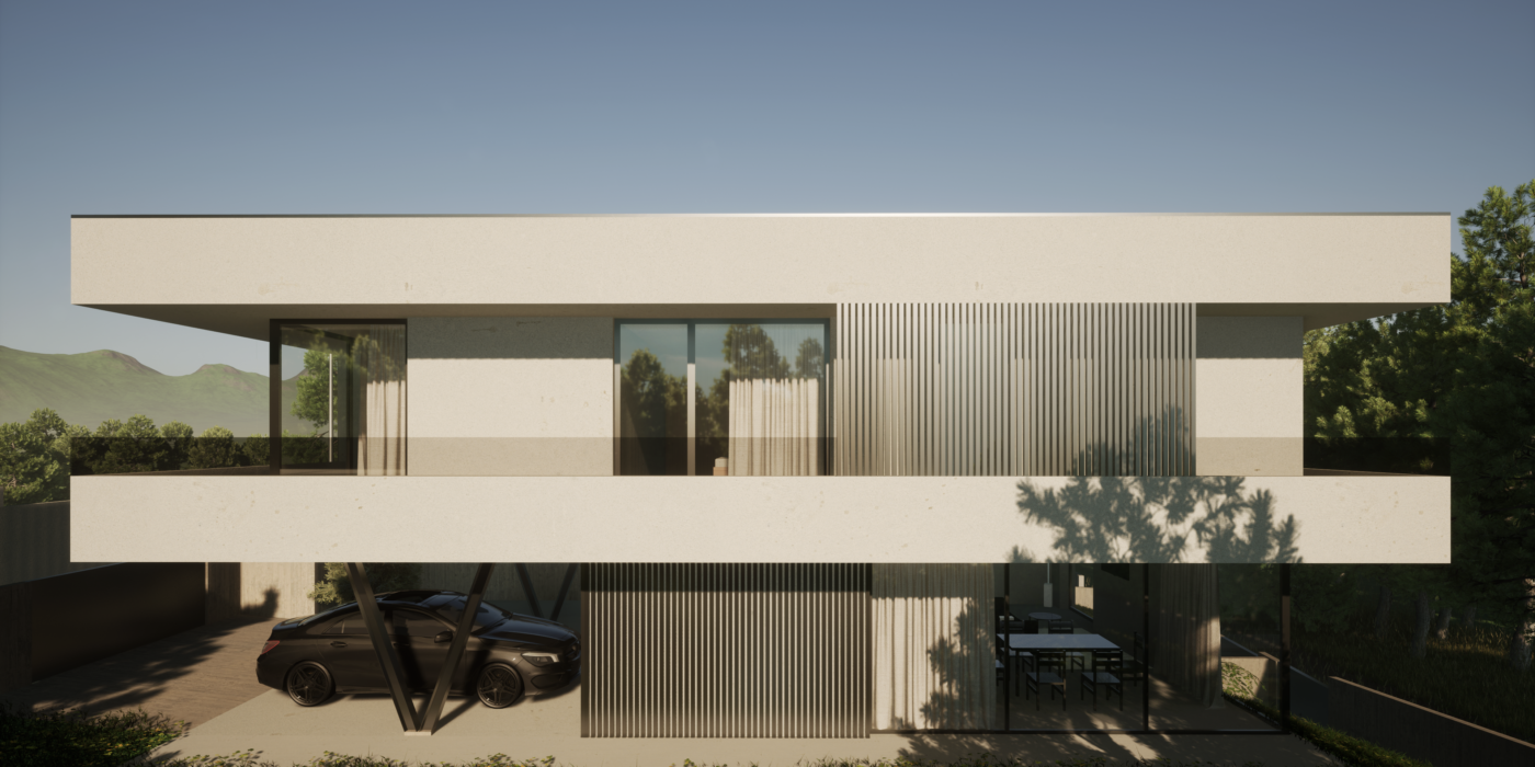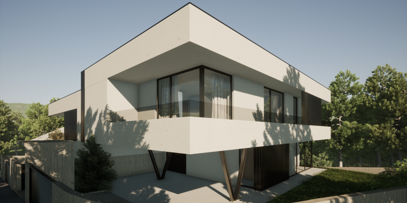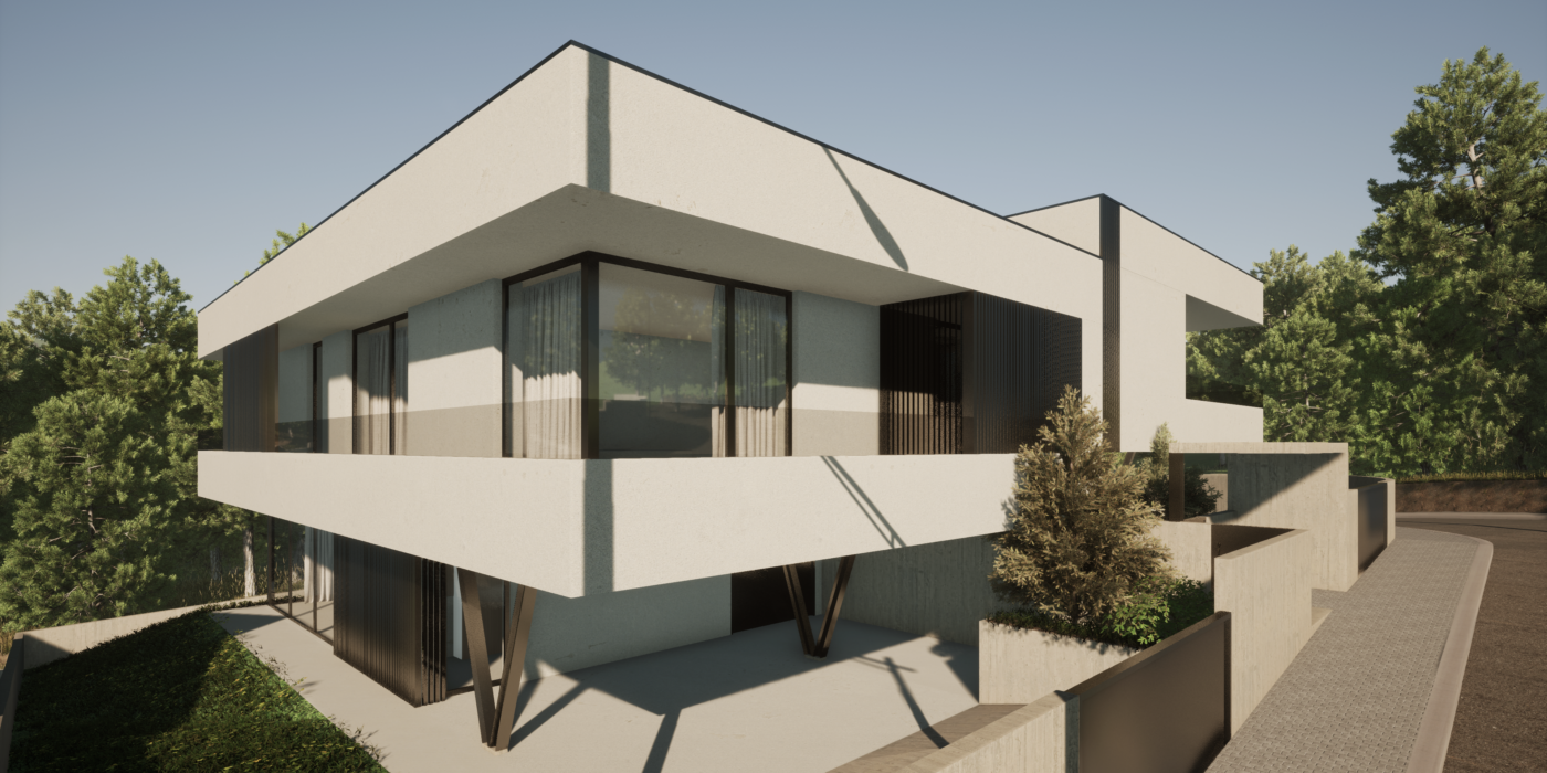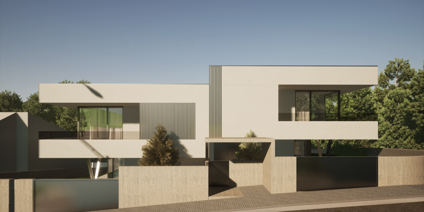 As premissas projetuais desta moradia (bi)familiar começam pelo motivo das suas próprias condicionantes, resultado das condições naturais do terreno, nomeadamente, a limitação de área e o seu forte declive. A sua volumetria resulta dessas mesmas limitações, formulada em três pisos, num jogo de volumes, saliências, e contrastes, relacionando-se, dessa forma, por semelhança, com a envolvente urbana adjacente e potencializando ao máximo o reflexo da sua envolvente natural no espaço privado e social.